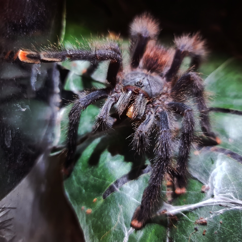 Personality: I've seen people ask if tarantulas have the capability to have a personality, or a distinct identity. My answer is no, but this answer does not stop me from apppreciating this animal and describing the general quirks that makes owning one so cool and special. I would describe it as owning a terrestrial fish. Since Avic avic's are arboreal you will see them more often than their terrestrial counterparts, though! She floats around, she has her nightly walks, and once she's ready to molt she builds her web. If she's happy and well fed she simply just sits around. Sometimes, at very rare occasions, she starts drumming her pedipalps against the glass, making a shocking amount of noise. This is her trying to attract a mate—but my poor lady shall remain a virgin!